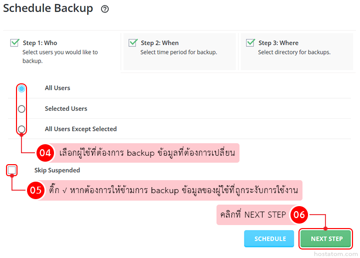เลือกผู้ใช้ที่ต้องการ backup ข้อมูลที่ต้องการเปลี่ยน และหากต้องการให้ข้ามการ backup ข้อมูลของผู้ใช้ที่ถูกระงับการใช้งานให้ติ๊กถูกที่ Skip Suspended จากนั้นคลิกที่ NEXT STEP
