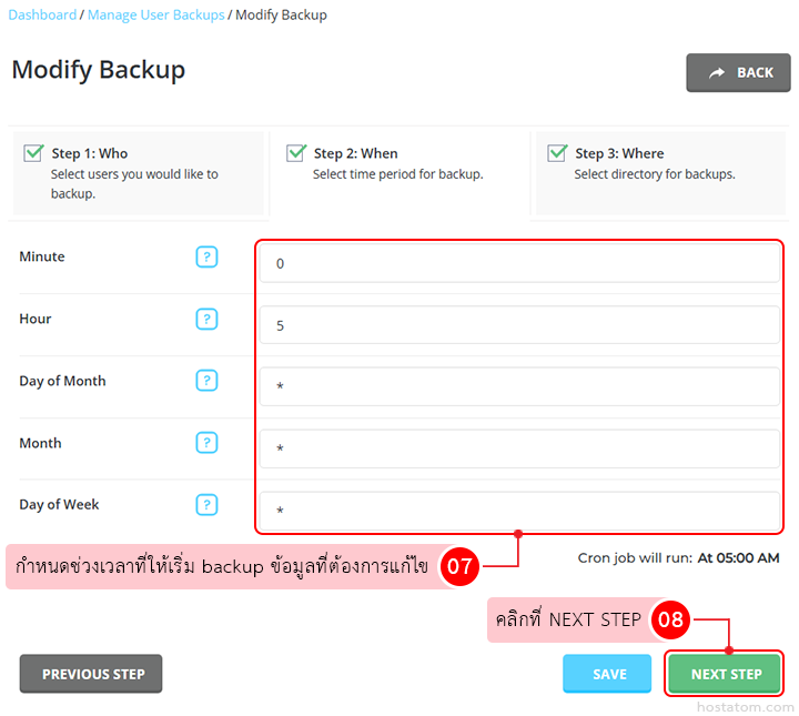 กำหนดช่วงเวลาที่ให้เริ่ม backup ข้อมูลที่ต้องการแก้ไข เมื่อเสร็จแล้วให้คลิกที่ NEXT STEP