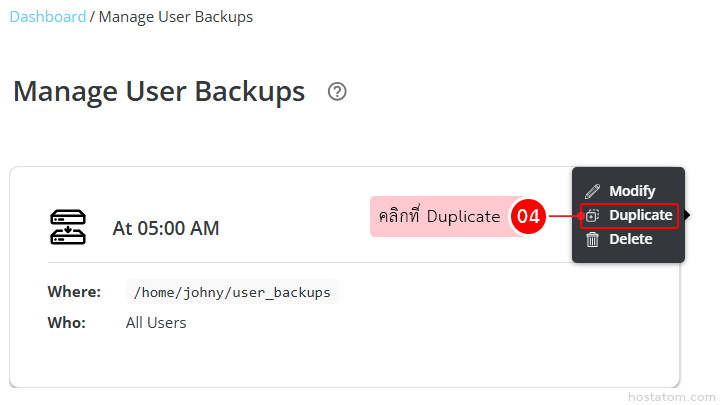 สำหรับผู้ที่ใช้งาน control panel ของ DirectAdmin ในระดับ reseller ที่ต้องการตั้งกำหนดการ backup ข้อมูลใหม่โดยเปลี่ยนแค่รายละเอียดบางส่วน เช่น เปลี่ยนผู้ใช้ที่ต้องการ backup ข้อมูล เปลี่ยนเวลาที่เริ่ม backup ข้อมูล ซึ่งสามารถใช้วิธีคัดลอกกำหนดการ backup ข้อมูลที่เคยตั้งไว้แล้วแก้ไขเฉพาะส่วนที่ต้องการได้ตามขั้นตอนต่อไปนี้