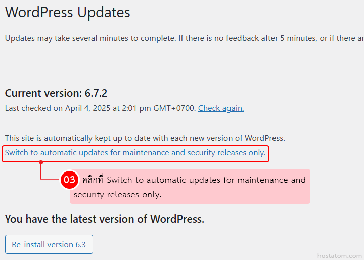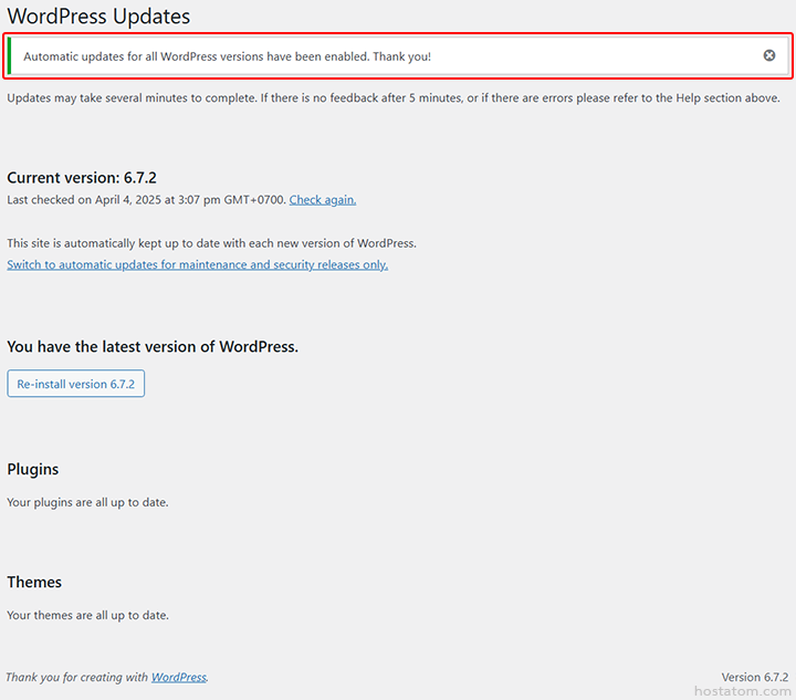ระบบจะแจ้งว่าได้เปลี่ยนให้อัปเดต WordPress โดยอัตโนมัติในทุกเวอร์ชัน