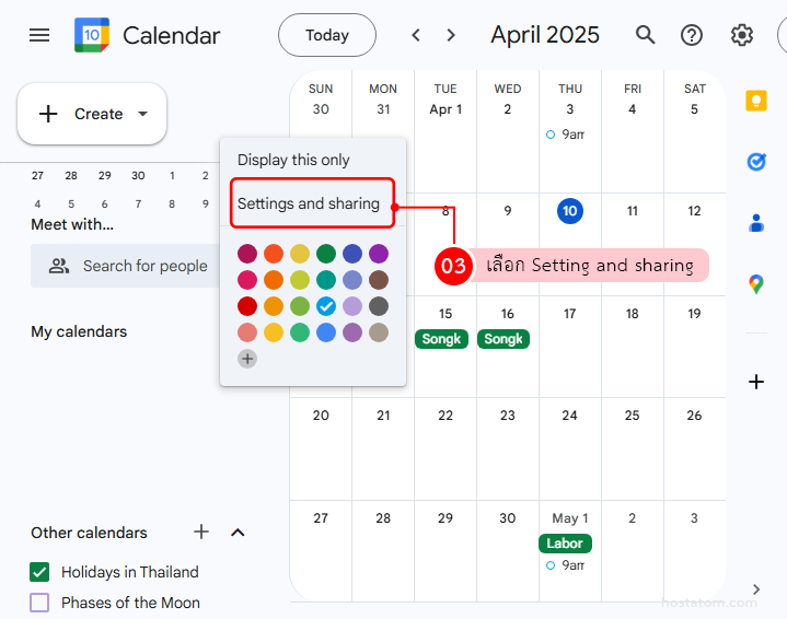 จากนั้นคลิกที่ … ของปฏิทิน และเลือก setting and sharing