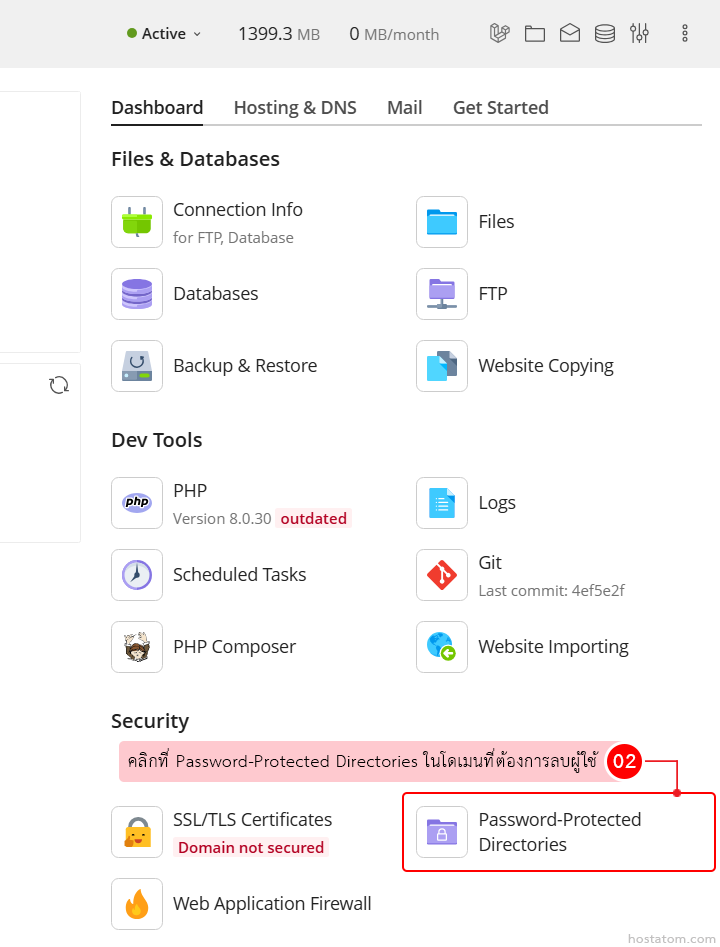 คลิกที่ Password-Protected Directories ในโดเมนที่ต้องการลบผู้ใช้