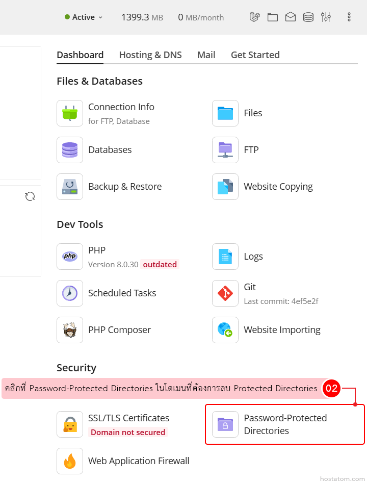 คลิกที่ Password-Protected Directories ในโดเมนที่ต้องการลบ Protected Directories