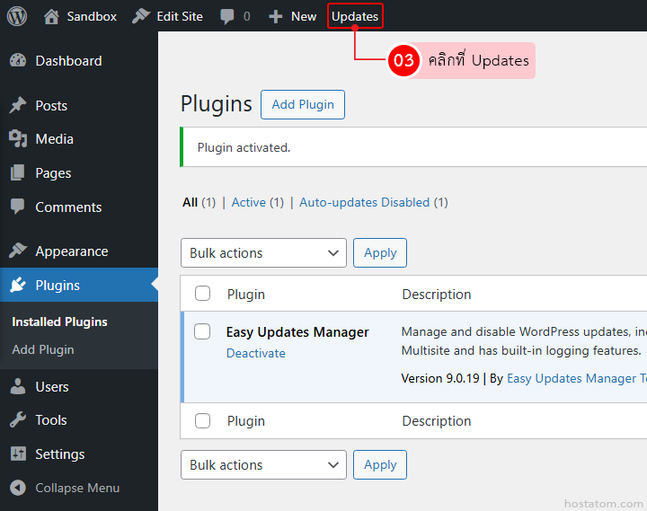 คลิกที่ Updates ในแถบ Admin Bar