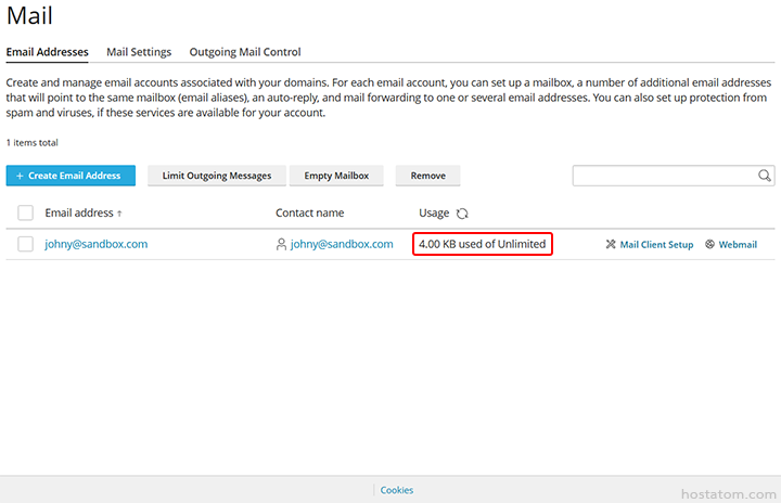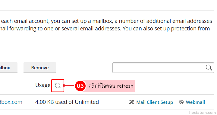 พื้นที่ mailbox ของบัญชีอีเมลแต่ละบัญชีจะแสดงอยู่ที่หัวข้อ Usage โดยจะแสดงว่าใช้พื้นที่ไปแล้วเท่าไหร่จากพื้นที่ทั้งหมดที่มี