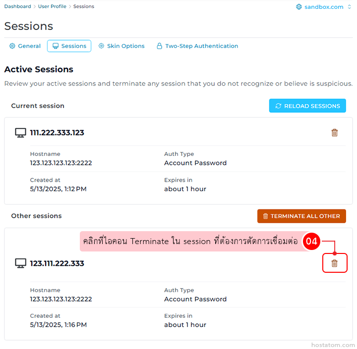 คลิกที่ไอคอน Terminate ใน session ที่ต้องการตัดการเชื่อมต่อ