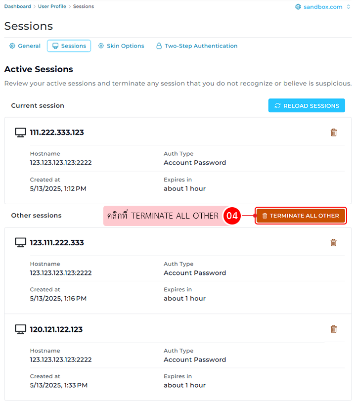 หากพบการเข้าสู่ระบบจาก IP ที่ไม่รู้จัก แนะนำให้เปลี่ยนรหัสผ่านทันทีหลังจากตัดการเชื่อมต่อ session ดังกล่าวแล้ว