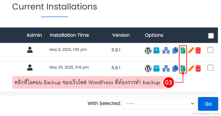 คลิกที่ไอคอน Backup ของเว็บไซต์ WordPress ที่ต้องการทำ backup