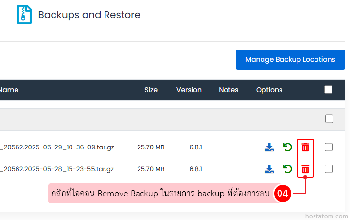 คลิกที่ไอคอน Remove Backup ในรายการ backup ที่ต้องการลบ