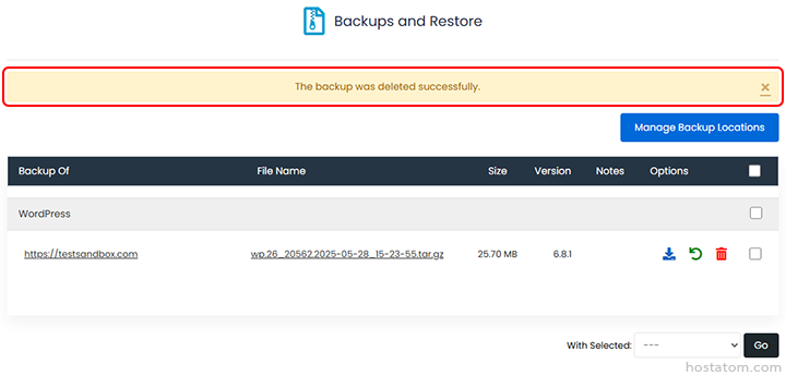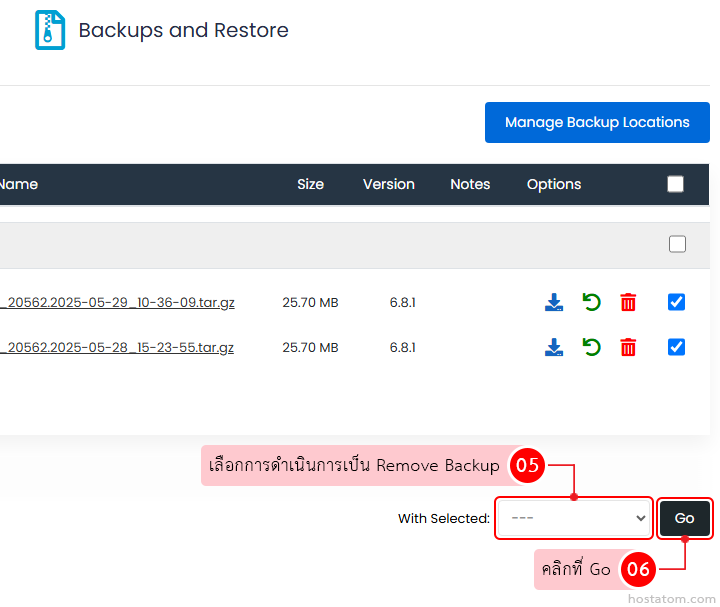 เลือกการดำเนินการใน With selected: เป็น Remove Backup จากนั้นคลิกที่ Go