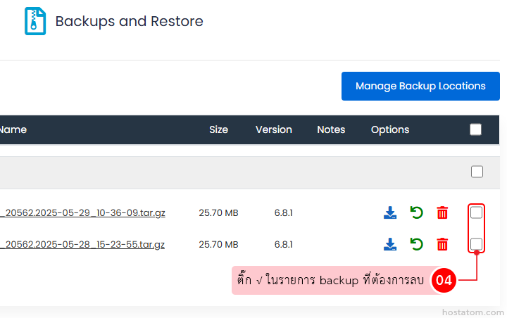 ติ๊ก √ ในรายการ backup ที่ต้องการลบ