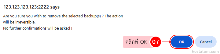ระบบจะแสดงหน้าต่างยืนยันการลบไฟล์ backup ที่เลือกขึ้นมา ให้คลิกที่ OK