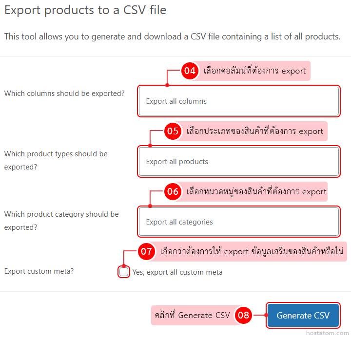 - Export custom meta? – เลือกว่าต้องการให้ export ข้อมูลเสริมของสินค้าหรือไม่