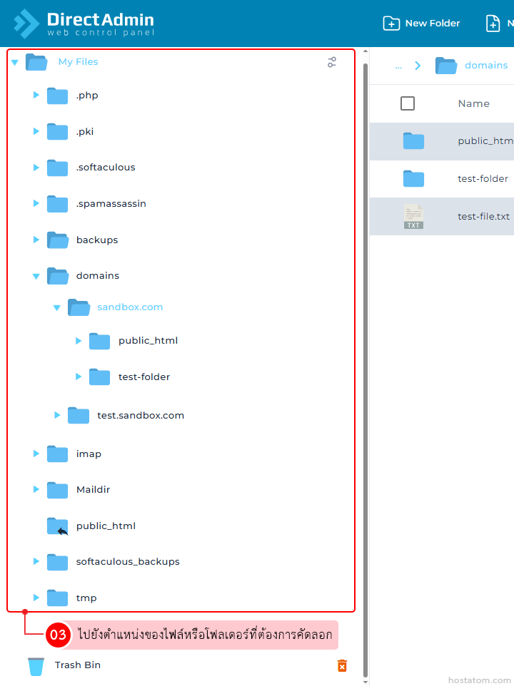 หากต้องการคัดลอกของไฟล์หรือโฟลเดอร์ด้วย File Manager ผ่าน control panel ของ DirectAdmin สามารถทำได้ตามขั้นตอนต่อไปนี้
