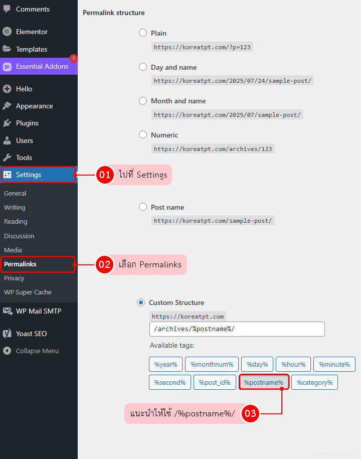 แนะนำให้ใช้โครงสร้างแบบ/%postname%/ เพื่อให้ URL สั้น อ่านง่าย และมีคำสำคัญ (Keyword)