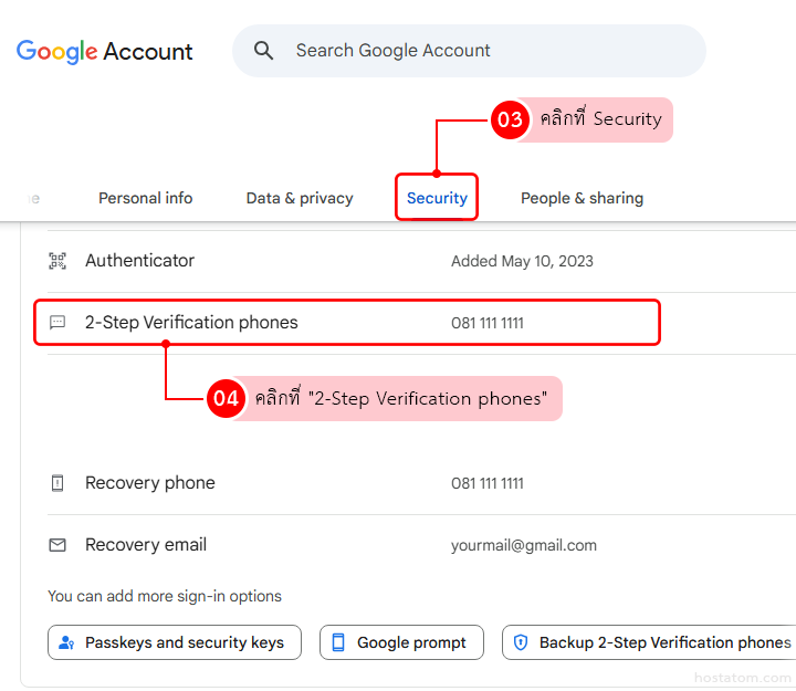 คลิกที่แท้บ Security เลื่อนลงมาข้างล่างเรื่อยๆ จนเจอคำว่า “2-Step Verification phones” คลิกที่ข้อความนี้