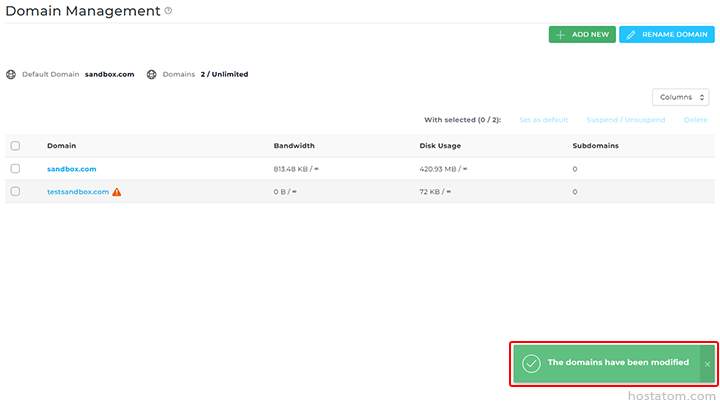 ระบบจะแจ้งว่าได้ระงับการใช้งานโดเมนดังกล่าวแล้ว โดยโดเมนที่ถูกระงับการใช้งานจะมีไอคอน suspend ต่อท้ายดังภาพตัวอย่าง