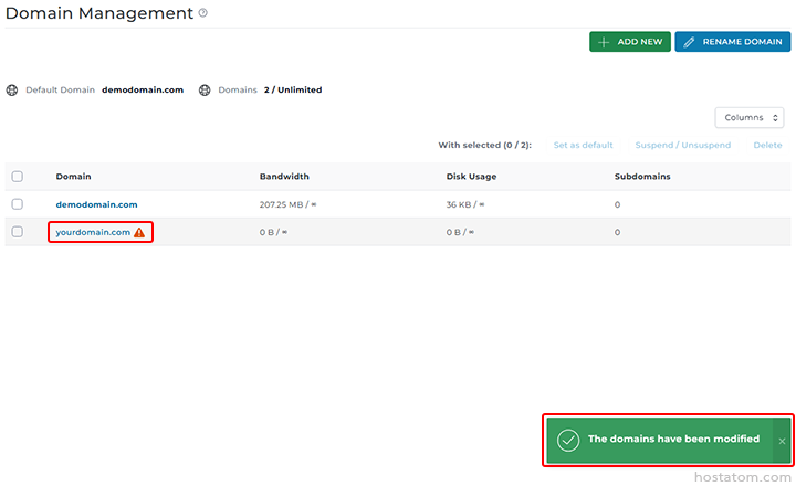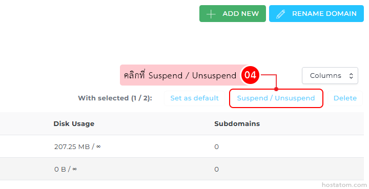 ระบบจะแจ้งว่าได้ระงับการใช้งานโดเมนดังกล่าวแล้ว โดยโดเมนที่ถูกระงับการใช้งานจะมีไอคอน suspend ต่อท้ายดังภาพตัวอย่าง