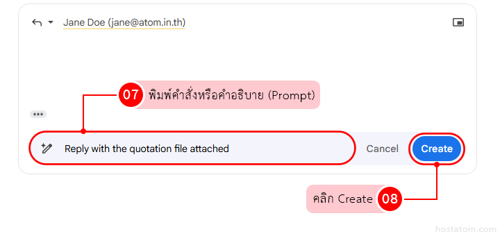 พิมพ์คำสั่งหรือคำอธิบาย (Prompt) เช่น “ตอบกลับพร้อมแนบไฟล์ใบเสนอราคา” คลิก “Create“