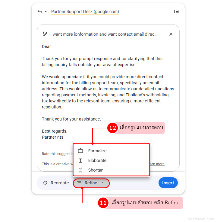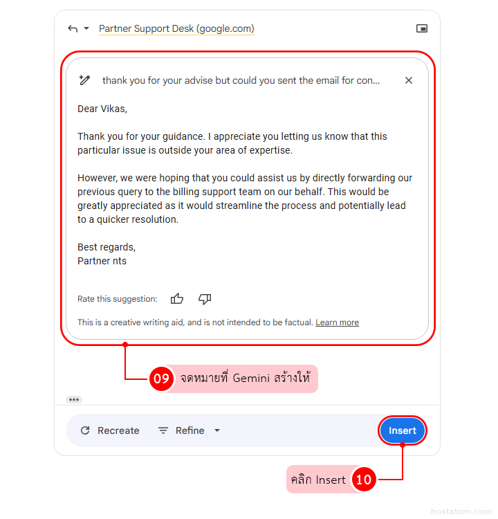 Gemini ก็จะเขียนอีเมลตอบกลับ หากจดหมายที่ AI เขียนแล้วเป็นที่พึงพอใจ ให้กด “Insert“