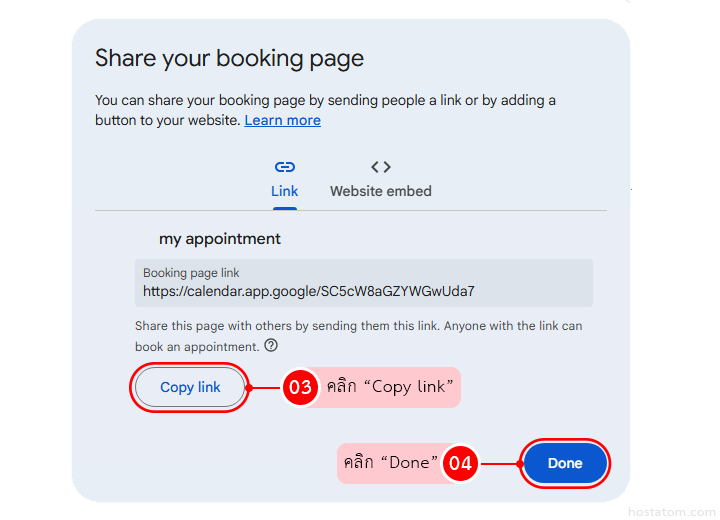 จะมีหน้าต่างแจ้งเข้ามา Share your booking page ซึ่งหากเราต้องการแชร์ตารางการนีดหมายของเราให้กับคนอื่นสามารถเลือกได้ว่า จะแขร์เป็น Link หรือฝังไว้บนหน้าเว็บ (Website embed)