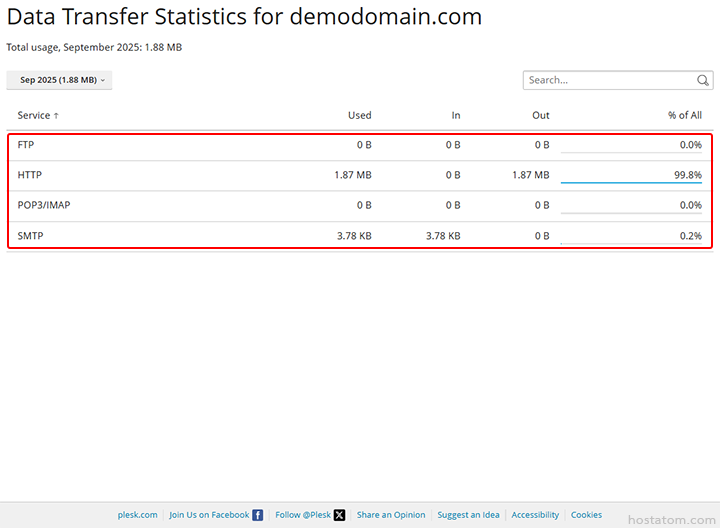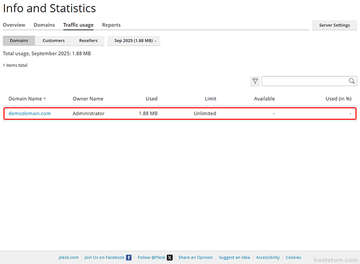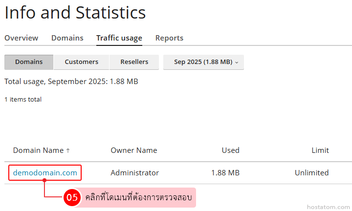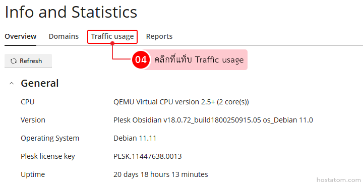 สำหรับผู้ที่ใช้งาน control panel ของ Plesk ในระดับ admin สามารถตรวจสอบการใช้งาน Traffic ของแต่ละโดเมนได้โดยตรง เพื่อดูปริมาณการรับ–ส่งข้อมูล ทั้งจาก HTTP, FTP, Email และอื่น ๆ ซึ่งช่วยในการวิเคราะห์การใช้งาน ตรวจสอบปัญหา หรือวางแผนการอัปเกรดทรัพยากรให้เหมาะสมกับลูกค้าได้