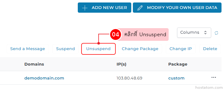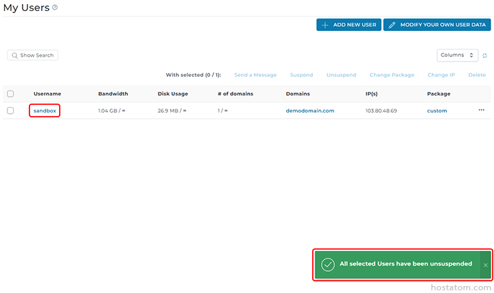 ระบบจะแจ้งว่าได้ปลดการระงับการใช้งานบัญชี user ดังกล่าวแล้ว โดยไอคอน suspended ที่ต่อท้าย Username จะหายไปดังภาพตัวอย่าง