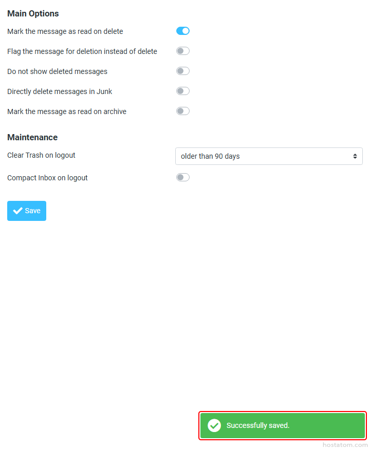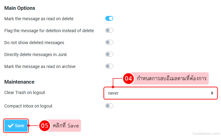กำหนดการลบอีเมลจากตัวเลือก Clear Trash on logout ในหมวด Maintenance ตามที่ต้องการ จากนั้นคลิกที่ Save