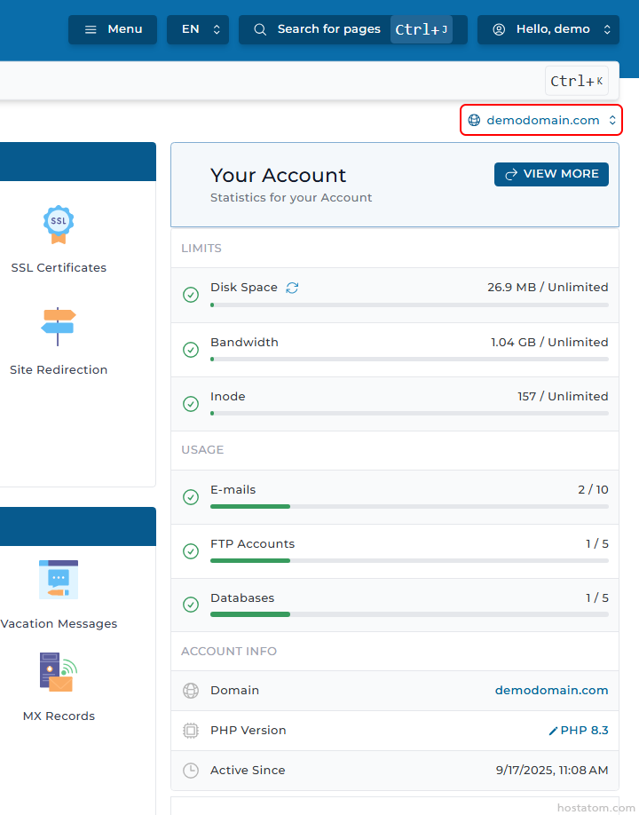 ในตอนที่เข้าสู่ระบบ โดเมนเริ่มต้นทางฝั่งขวาจะแสดงเป็นโดเมนปัจจุบัน โดยในคู่มือนี้จะแสดงเป็น demodomain.com