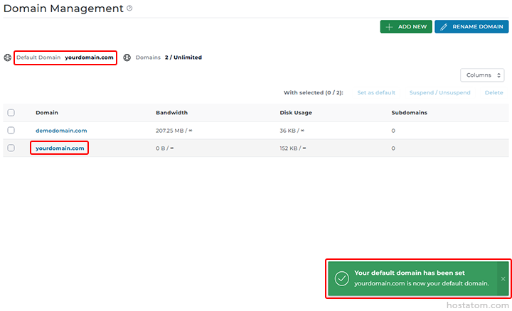 ระบบจะแจ้งว่าได้เปลี่ยนโดเมนดังกล่าวให้เป็นโดเมนเริ่มต้นแล้ว โดยที่ Default Domain จะระบุเป็นโดเมนที่เลือก และโดเมนที่เป็นโดเมนเริ่มต้นจะมีชื่อโดเมนเป็นตัวหนาดังภาพตัวอย่าง
