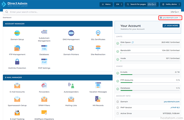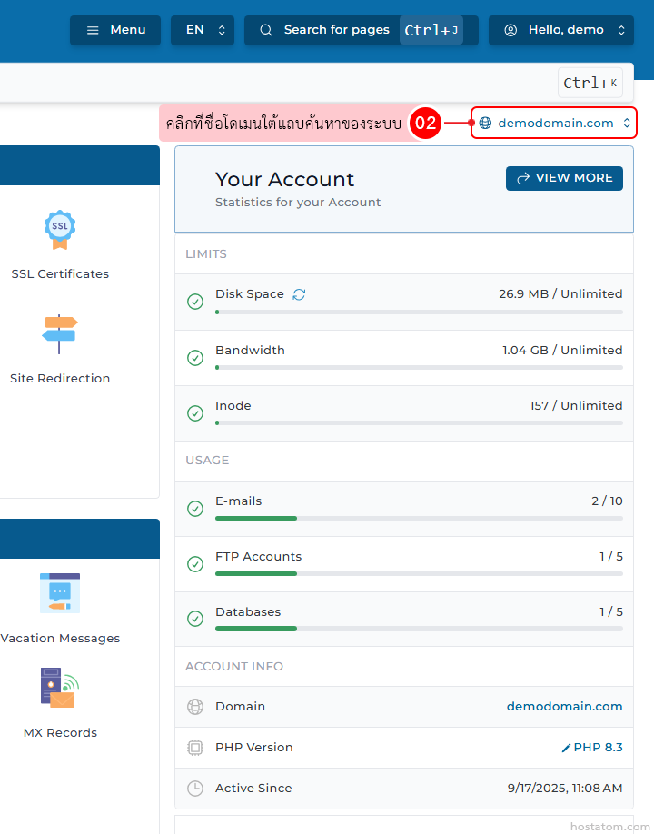 หลังเข้าสู่ระบบ ที่ฝั่งขวาใต้แถบค้นหาของระบบจะแสดงชื่อโดเมนปัจจุบันอยู่ (ในคู่มือจะแสดงเป็น demodomain.com) ให้คลิกที่ชื่อโดเมนดังกล่าว