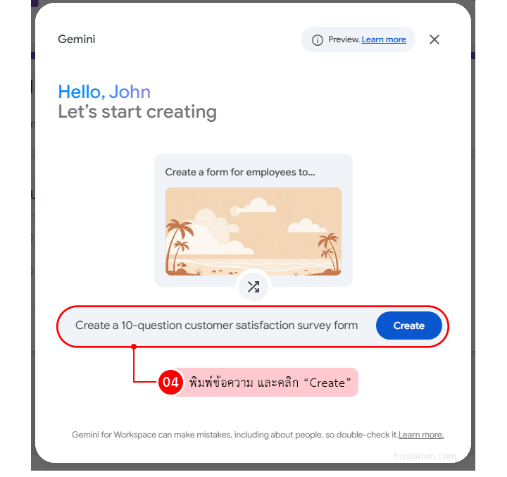 พิมพ์ข้อความที่ต้องการให้ Gemini สร้างฟอร์มให้ จากนั้นคลิก “Create