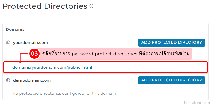 สำหรับผู้ที่ใช้งาน control panel ของ DirectAdmin สามารถเปลี่ยนรหัสผ่านของโฟลเดอร์ที่ตั้งค่าให้เข้าถึงได้เฉพาะผู้ที่มีสิทธิ์ (Password Protected Directories) ได้ตามขั้นตอนต่อไปนี้