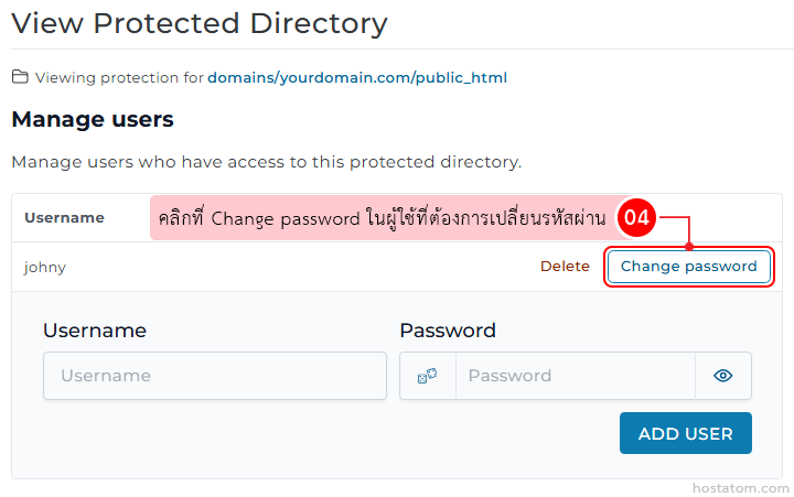 สำหรับผู้ที่ใช้งาน control panel ของ DirectAdmin สามารถเปลี่ยนรหัสผ่านของโฟลเดอร์ที่ตั้งค่าให้เข้าถึงได้เฉพาะผู้ที่มีสิทธิ์ (Password Protected Directories) ได้ตามขั้นตอนต่อไปนี้