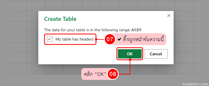 จากนั้นให้ติ๊กถูก ✔️ หน้าหัวข้อ “My table has headers” (ตารางของฉันมีหัวเรื่อง)