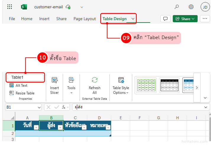 ตั้งชื่อ Table ที่เราสร้าง โดยคลิกที่ Tabel Design ตั้งชื่อ Table1 (หรือจะใช้ชื่ออื่นก็ได้นะคะ)