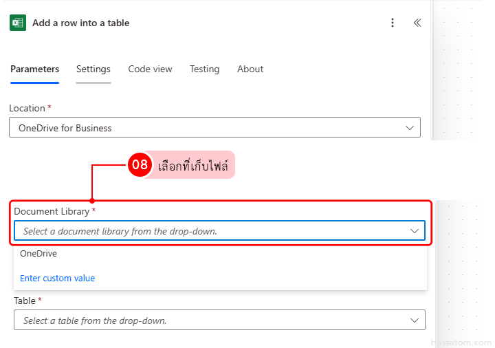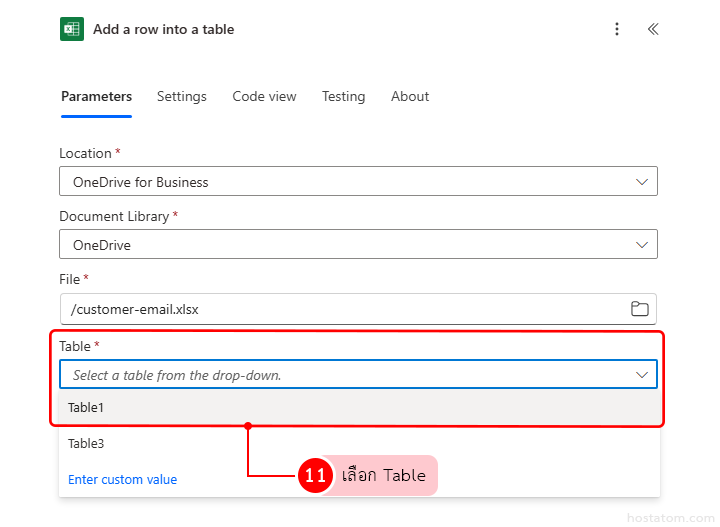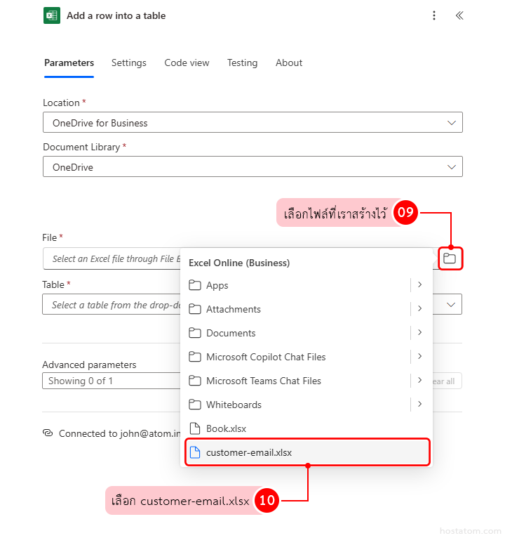 Power Automate สามารถเชื่อมกับไฟล์ Excel ที่อยู่บน OneDrive/SharePoint แล้วทำงานกับ “Table” ภายในนั้นได้เลยจากนั้นให้จำชื่อไฟล์และ Table ไว้