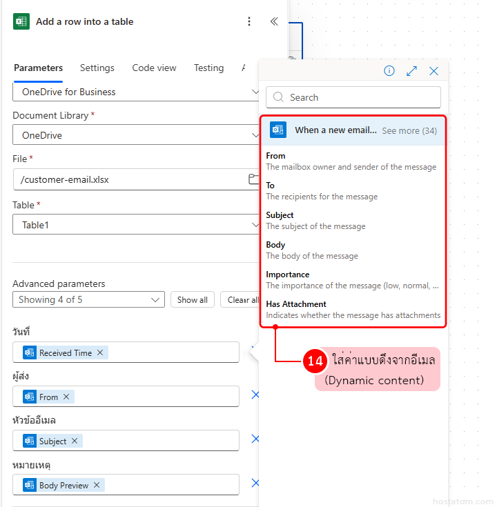 ในช่องคอลัมน์ให้ใส่ค่าแบบดึงจากอีเมล (Dynamic content) เช่น