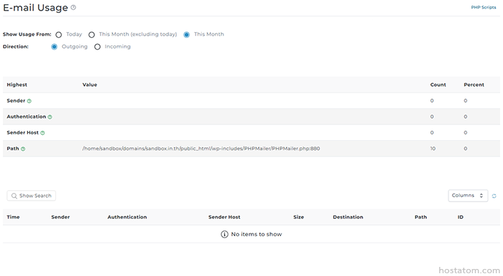 - Outgoing – ดูสถิติของอีเมลขาออก (เมลที่ส่งออกจากเซิร์ฟเวอร์)