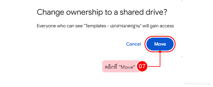 ระบบอาจแจ้งเตือนเรื่องการเปลี่ยนเจ้าของไฟล์ (Change ownership to a shared drive) ให้กด Move เพื่อยืนยันอีกครั้ง