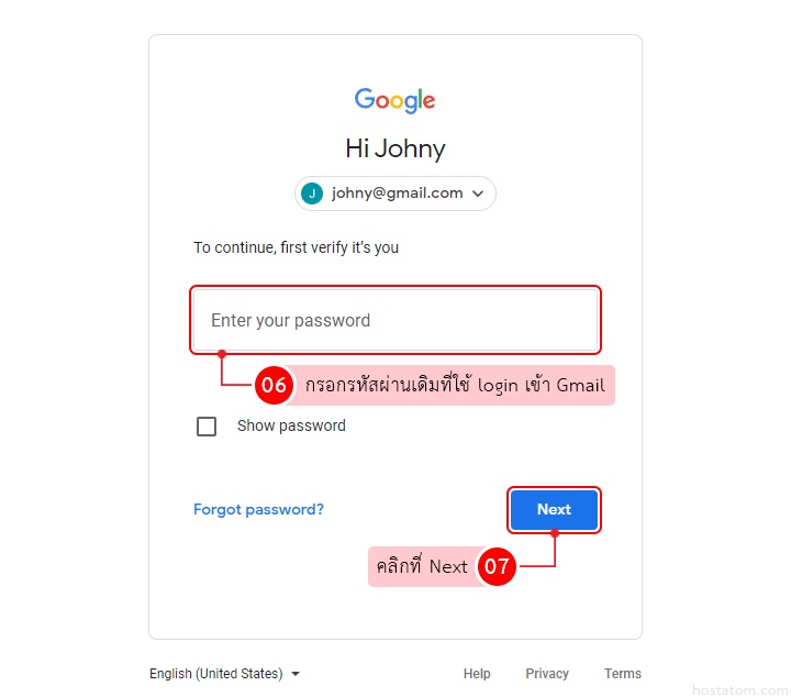 ระบบจะให้ยืนยันตัวตนผู้ใช้งาน ให้กรอกรหัสผ่านเดิมที่ใช้ login เข้า Gmail
