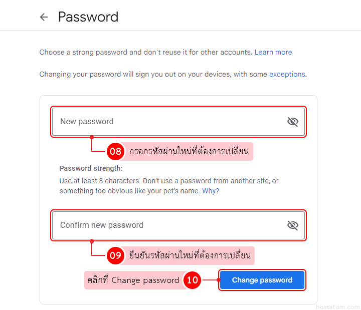 กรอกรหัสผ่านใหม่ที่ต้องการเปลี่ยนในช่อง New password และยืนยันรหัสผ่านใหม่ที่ต้องการเปลี่ยนในช่อง Confirm new password จากนั้นคลิกที่ Change password