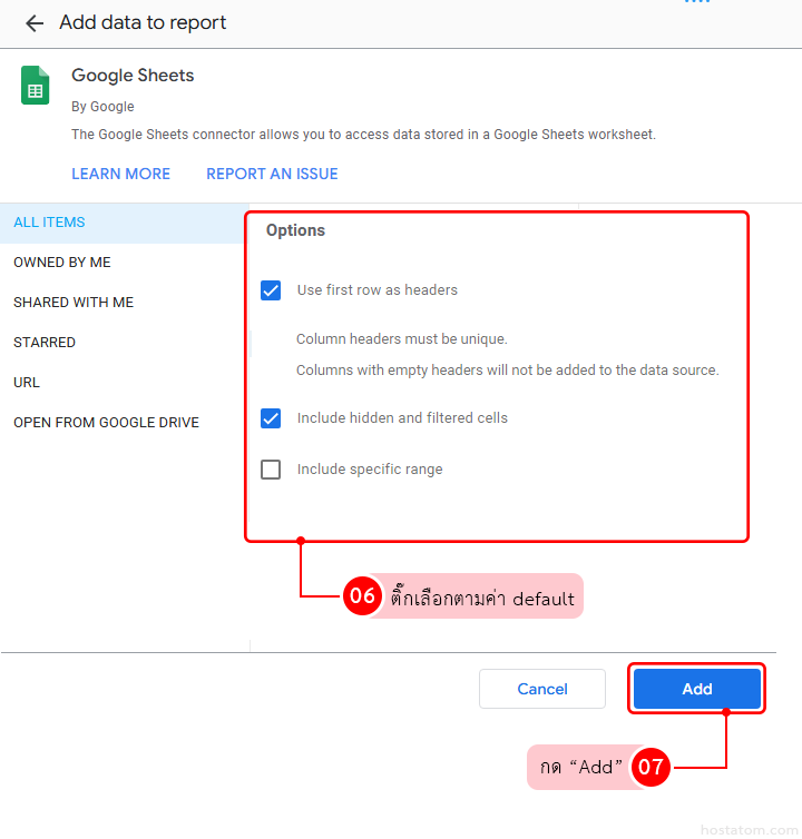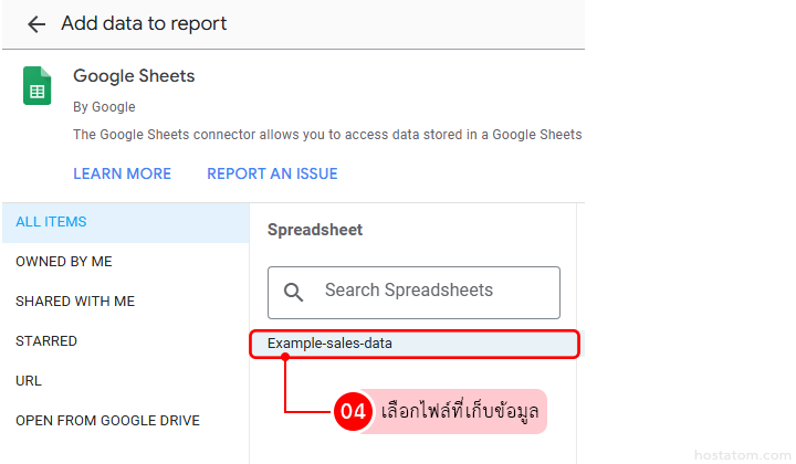 - สร้างรายงานใหม่ใน Looker Studio แล้วเชื่อม Data Source เป็น Google Sheet ที่เตรียมไว้