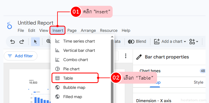 ในหน้ารายงาน Looker Studio ให้ดูที่แถบเมนูด้านบน คลิกที่ “Insert → เลือก Vertival bar chart“