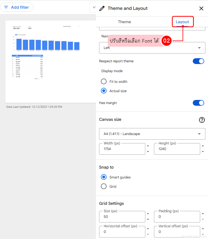 สามารถปรับสีพื้นหลัง, สีกราฟ, สีหัวตาราง ฯลฯ ได้ และ เลือก Font ได้ ที่ “Layout “