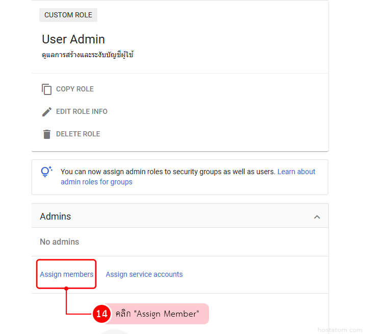 หลังจากสร้าง Custom Admin Role แล้ว ขั้นต่อไปคือการกำหนดบทบาทให้ผู้ใช้ที่เกี่ยวข้อง