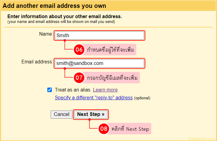 กำหนดชื่อผู้ใช้และกรอกบัญชีอีเมลที่จะเพิ่ม จากนั้นคลิกที่ Next Step