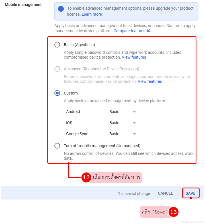 - Custom: เลือกระดับการจัดการแยกตามอุปกรณ์/ระบบได้เอง (Android, iOS, Google Sync)