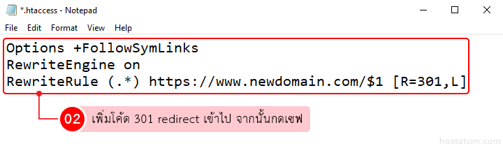 เพิ่มโค้ด 301 redirect เข้าไปที่ตอนต้นของไฟล์ (เปลี่ยน https://www.newdomain.com เป็นชื่อโดเมนที่จะ redirect) จากนั้นกดเซฟ