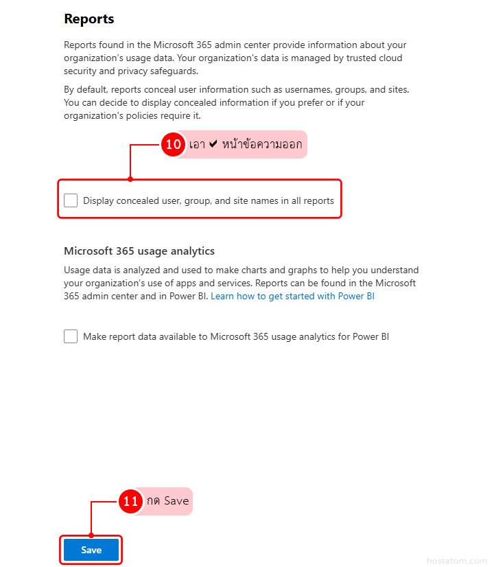 ถ้าต้องการให้รายงานแสดงชื่อผู้ใช้ กลุ่ม และไซต์จริง ให้ เอาเครื่องหมายถูกออก จากตัวเลือกนี้ แล้วกด Save